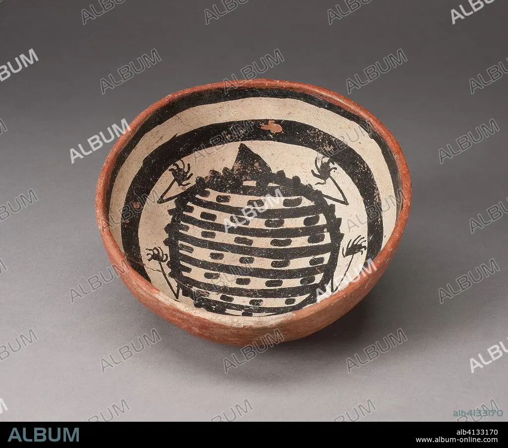MIMBRES. Small Bowl with an Abstract Insect or Animal Painted in Interior. Mogollon; Southeastern Arizona or southwest New Mexico, United States. Date: 950 AD-1150. Dimensions: Diam. 15.2 cm (6 in.). Ceramic and pigment. Origin: Arizona.