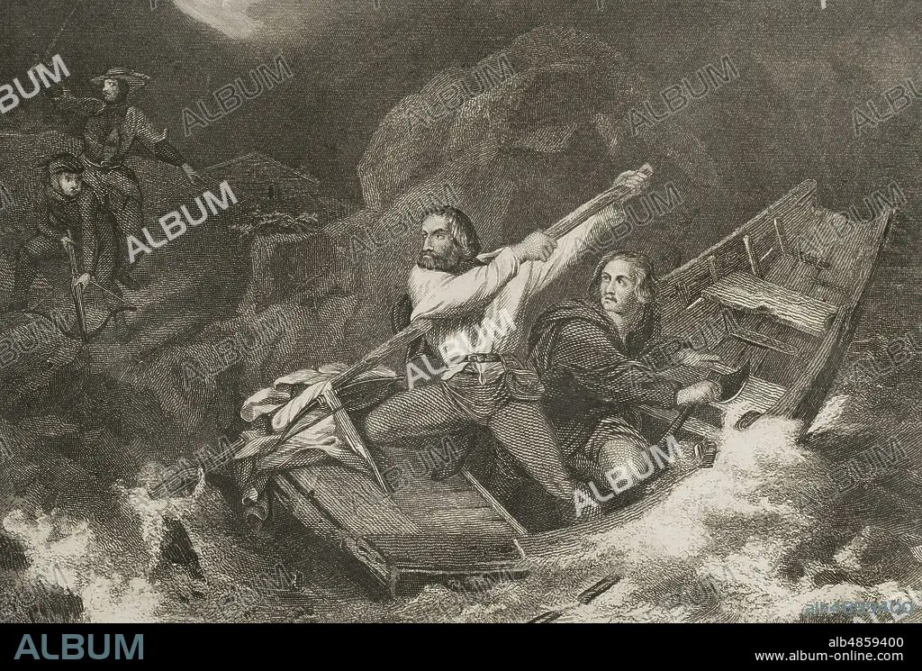 Descripción: Guillermo Tell (Wilhelm Tell). Personaje legendario, considerado el héroe nacional de Suiza. Guillermo Tell salvando a Konrad Baumgarten, durante una tormenta en aguas del lago de Uri, huyendo de los soldados. Grabado. Historia de las persecuciones políticas y religiosas en Europa. Tomo I. Editado en Barcelona, 1863.