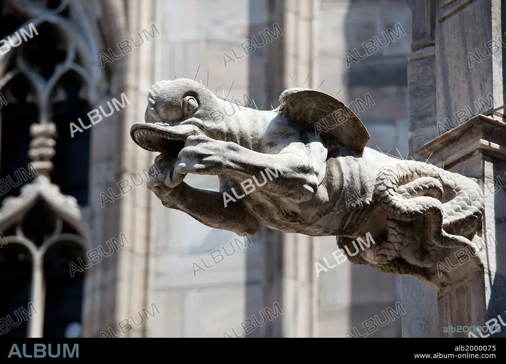 Italy, Milan, Milan Cathedral, Gargoyles. Made in the typical stone used in Gothic cathedral architecture, they are made in the shapes of animals belonging to the medieval bestiary, grotesques or, more rarely, in human form. They are a widely diffused sculptural feature in the Milan Cathedral and are found on the spires and smaller terraces and as part of the large ones, along the outside of the building.