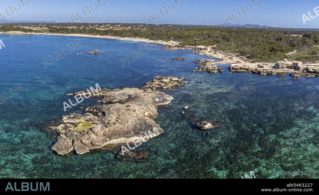 Estopa islet and Es Dolç Beach, Ses Salines, Mallorca, Balearic Islands, Spain.