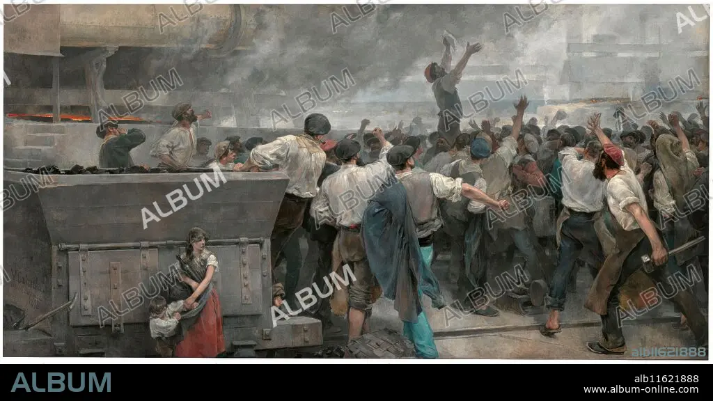 Descripción: Vicente Cutanda y Toraya / 'Una huelga de obreros en Vizcaya'. 1892. Óleo sobre lienzo, 275 x 550 cm