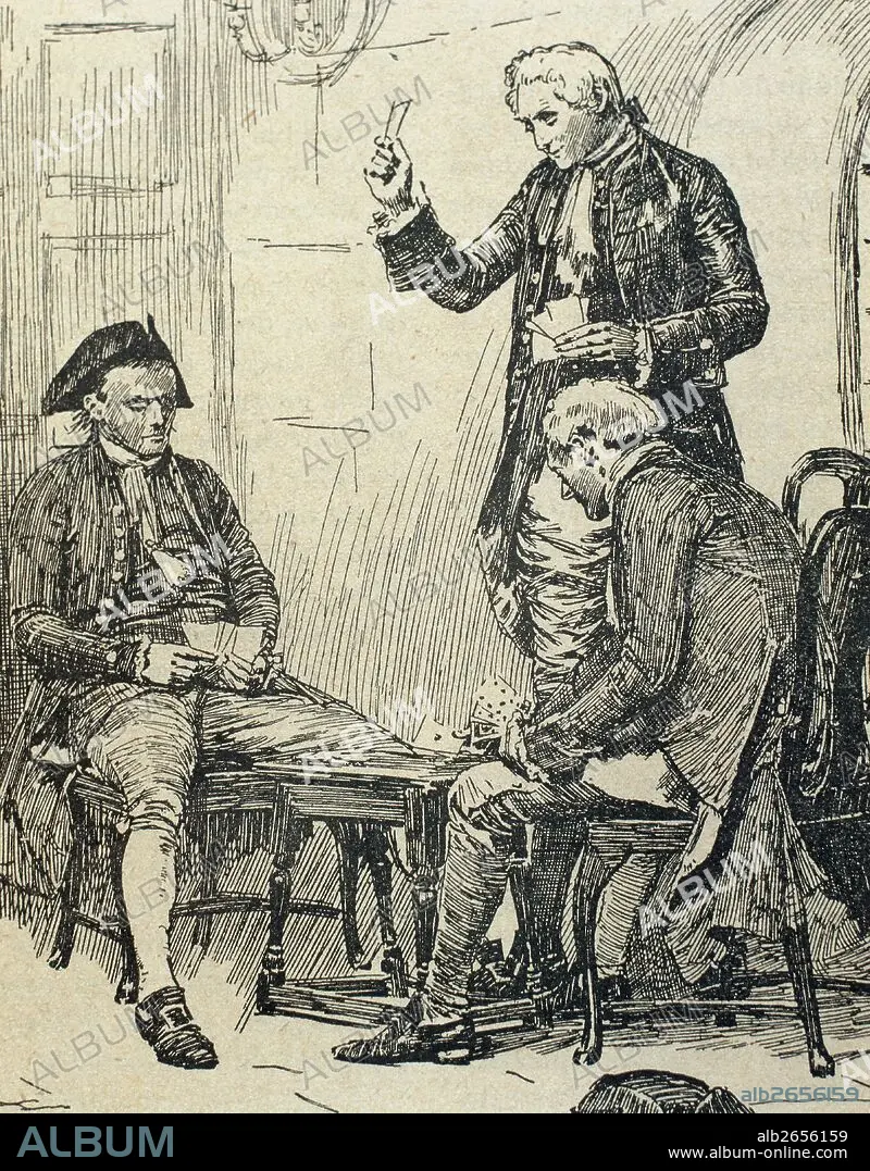 Descripción: REVOLUCION FRANCESA. Periodo que comprende desde la apertura de los Estados Generales (5 de mayo de 1789) al Golpe de Estado del 18 de brumario (9-XII-1799). "EL CONDE FERRERS JUGANDO AL PIQUET CON SUS CARCELEROS, ANTES DE SU EJECUCION". Grabado del siglo XIX.