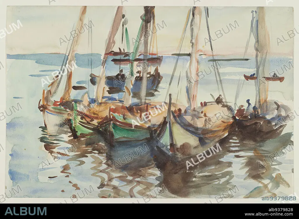 Portuguese Boats, John Singer Sargent, American, born Italy, 1856-1925, Translucent watercolor and touches of opaque watercolor with graphite underdrawing, ca. 1903, 12 x 18 1/16 in., 30.5 x 45.9 cm, American watercolor, Atlantic Ocean, Boat, marine, masts, ndd01, Portugal, rigging, ripples, sailboats, seascape, water.