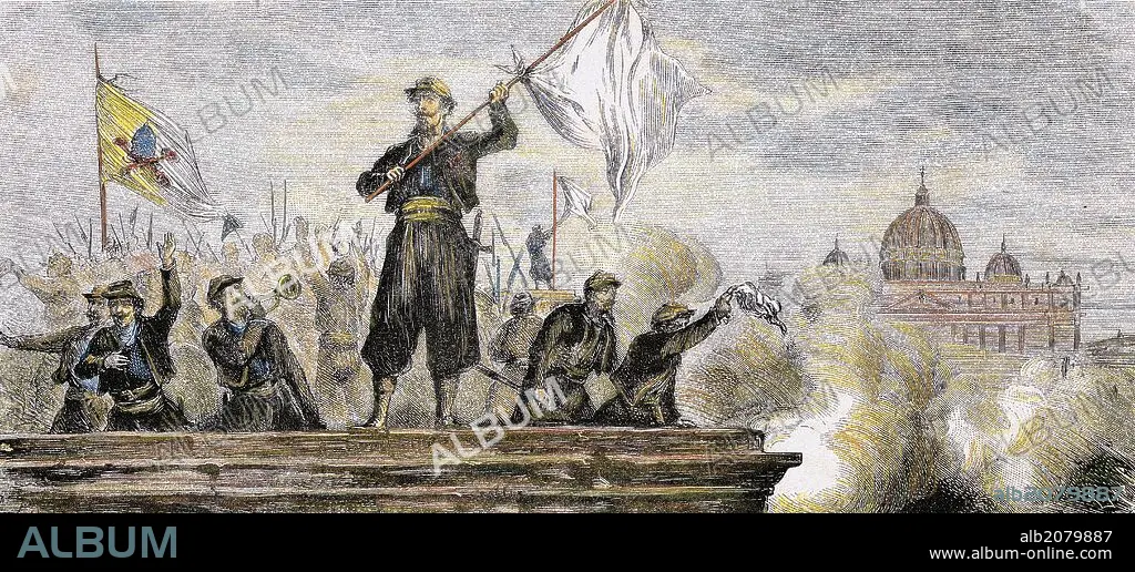 Descripción: UNIFICACION ITALIANA (1859-1924). "LAS TROPAS PONTIFICIAS PIDEN PARLAMENTO POR ORDEN DE SU SANTIDAD EN ROMA". Grabado coloreado de la Ilustración Española y Americana, año 1870.