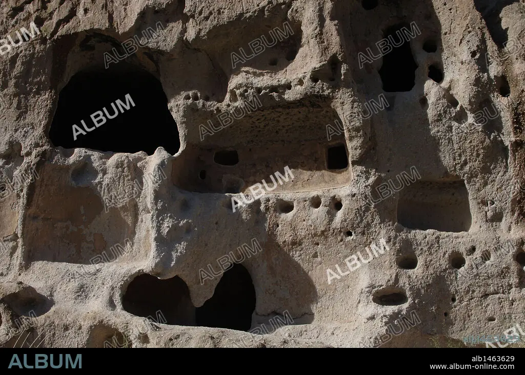 ARTE PREHISTORICO. NEOLITICO. AMERICA. CULTURA ANASAZI. Ancestros de los Indios Pueblo. MONUMENTO NACIONAL BANDELIER (BANDELIER NATIONAL MONUMENT). Cuevas utilizadas como viviendas. Estado de Nuevo México. Estados Unidos.
