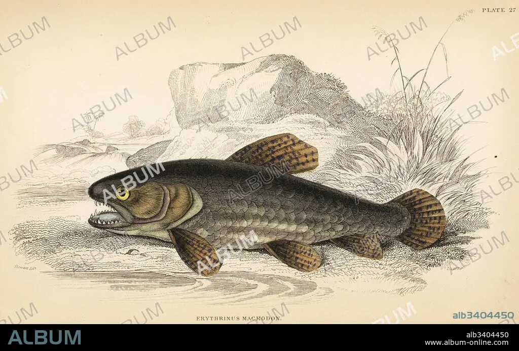 Wolf fish, tiger fish or trahira, Hoplias malabaricus (Haimura, Erythrinus macrodon). Handcoloured steel engraving by W.H. Lizars after an illustration by James Stewart from Robert Schomburgk's Fishes of Guiana, part of Sir William Jardine's Naturalist's Library: Ichthyology, Edinburgh, 1841.