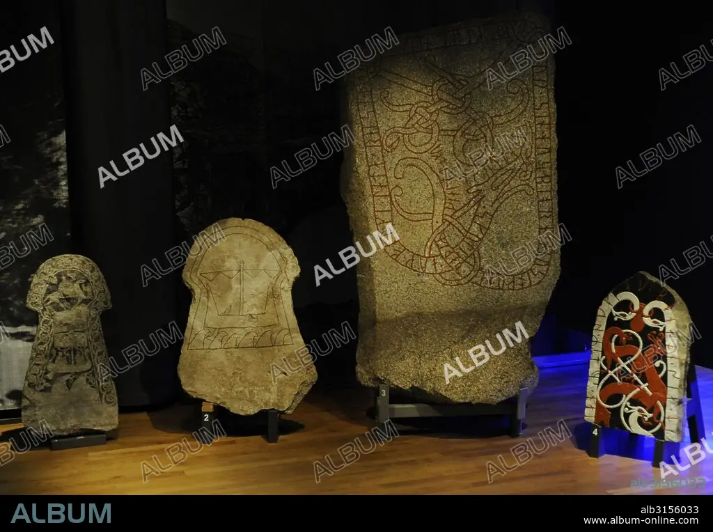 Descripción: Piedras rúnicas. 1. Piedra de Lillbjärs, Gotland; 2. Piedra Gotland (localidad desconocida); 3. Piedra rúnica de Resmo, Isla de Öland. Texto: Ina erigió la piedra en memoria de Sveina, su marido y 4. Piedra rúnica de Torsätra, provincia de Uppland. Texto: Skule y Folke levantaron la piedra en memoria de su hermano Husbjörn, que enfermó al recoger impuestos en Gotland. Museo Histórico. Estocolmo. Suecia.
