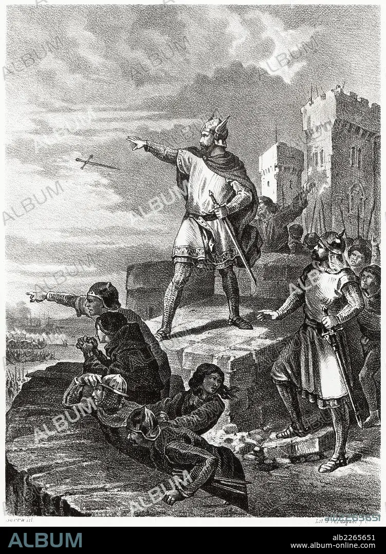 Historia de España. Alfonso Pérez de Guzman (1256-1309), conocido como Guzmán el Bueno, arrojando el puñal a los atacantes para sacrificar a su hijo en defensa de la plaza de Tarifa en 1294. Grabado de 1872.