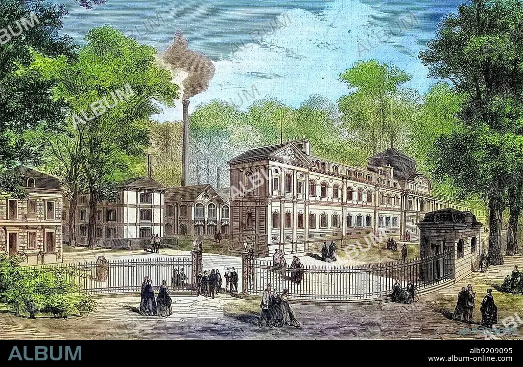 New buildings of the imperial porcelain manufactory in Sevres, Manufacture royale de porcelaine de Sèvres is one of the most important European manufactories for the production of fritted porcelain, 1869, France, Historic, digitally restored reproduction of an original 19th century master, exact original date unknown, Europe