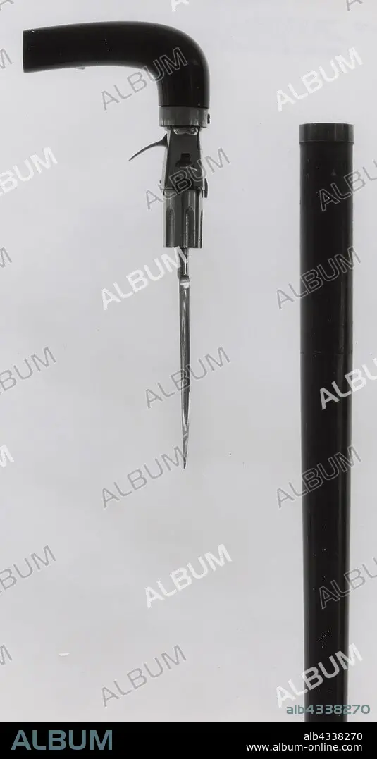 Combined Walking-Cane, Rimfire Pepperbox Revolver, and Stiletto, second half of 19th century, French (?), possibly American(?), France, Wood, leather, brass, silver, horn, steel, and nickel, L. 87.3 cm (34 3/8 in.).