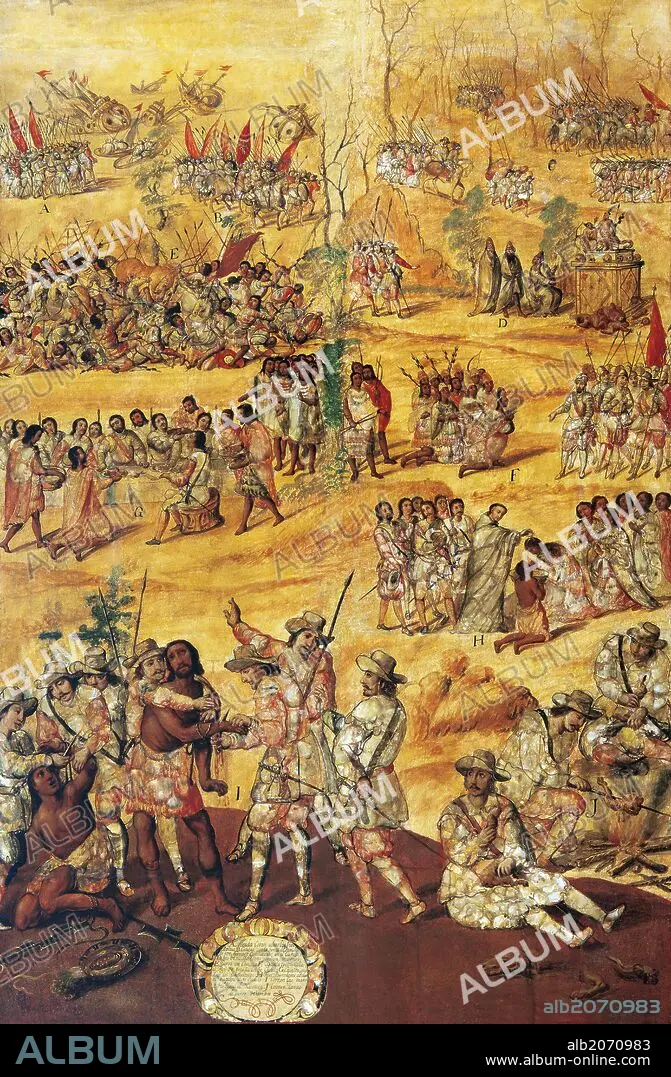 Descripción: CONQUISTA DE MEXICO (1519). Cuadro enconchado de Miguel GONZÁLEZ (1698), donde describe distintas etapas de la CONQUISTA DE MEXICO realizada por Hernán Cortés y su ejército. Museo de América. Madrid. España.