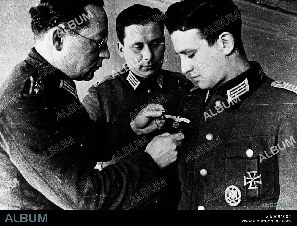 History / World War II / Nationalkomitee Freies Deutschland (Formed by German Communist emigrants & POWs in Moscow, 12-13/7/1943; campaigned via radio and leafleting for the overthrow of Hitler). - The secretary of a NKFD POW group removes the Nazi emblems from the uniform of lieutenant Philipps, who has joined the group. Photo, c. 1944.