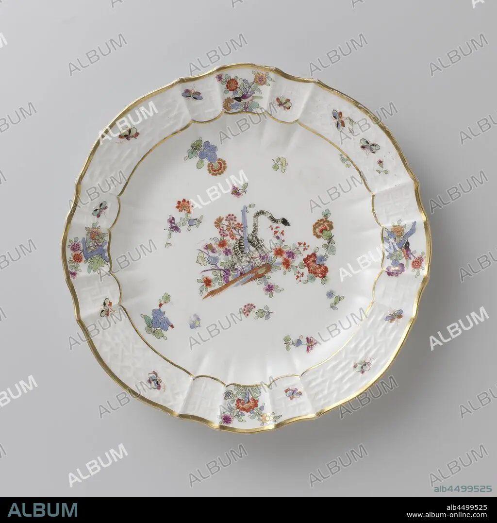 Round plate, multi-colored with a Kakiemon decor, Round plate of painted porcelain. The plate is ribbed and has a scalloped edge. The plate is painted with a tiger that is wrapped around a blue bamboo stalk among flowers, scattered Indian Blumen, butterflies and branches on which birds. The border is decorated with the 'Altbrandenstein' pattern. The sign is marked., Meissener Porzellan Manufaktur, Meissen, c. 1740 - c. 1745, porcelain (material), d 24.0 cm h 3.5 cm.