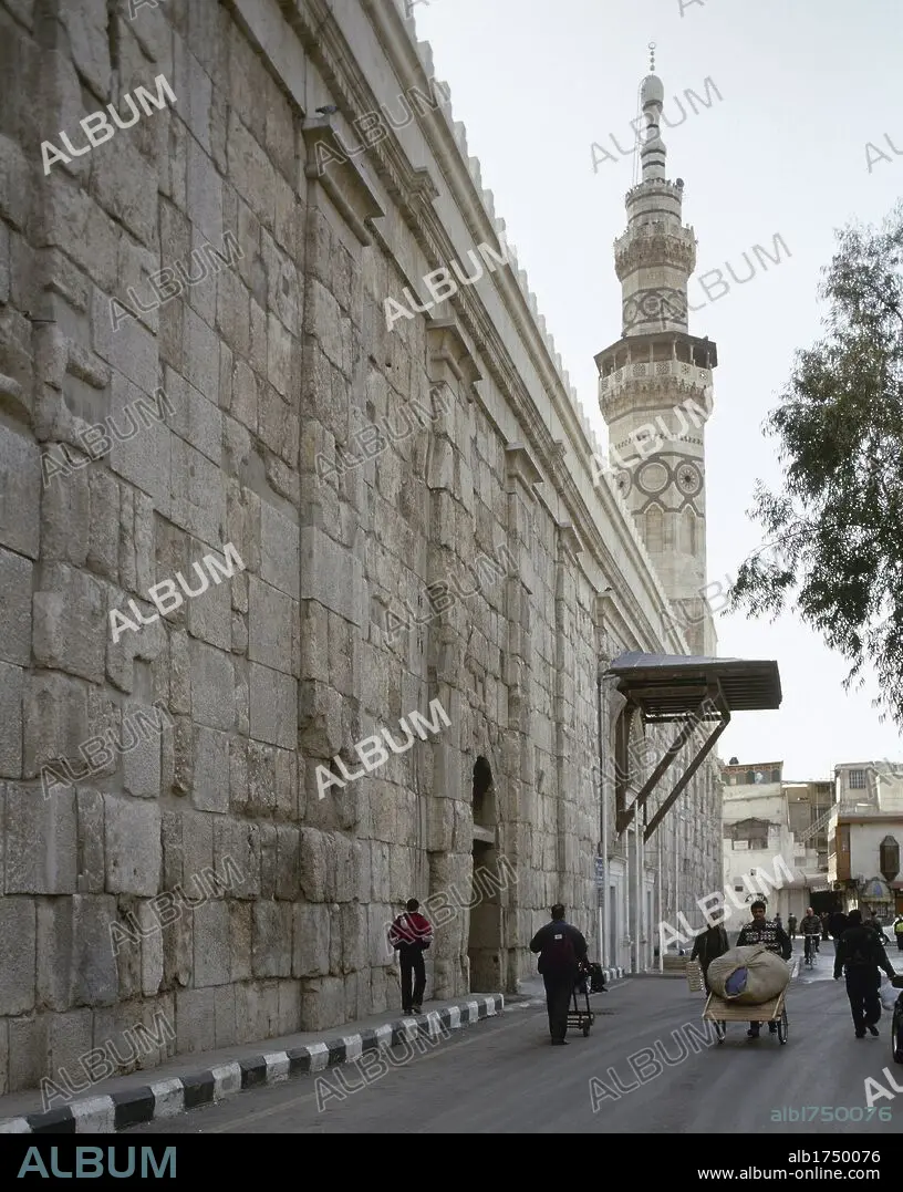 SIRIA. DAMASCO. Vista del muro exterior de la MEZQUITA OMEYA, construida a principios del siglo VIII. Destaca uno de sus minaretes.