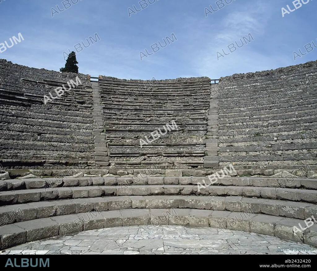 ARTE ROMANO. ITALIA. ODEON o PEQUEÑO TEATRO. Edificio civíll realizado en el siglo II d. C. con capacidad para 1000 personas. Vista general desde la "ORQUESTA" de las GRADAS SUPERIORES Y MEDIAS ("SUMMA CAVEA" y "MEDIA CAVEA"). Las cuatro gradas inferiores ("IMA CAVEA") estaban reservadas para altas personalidades. POMPEYA. La Campania.
