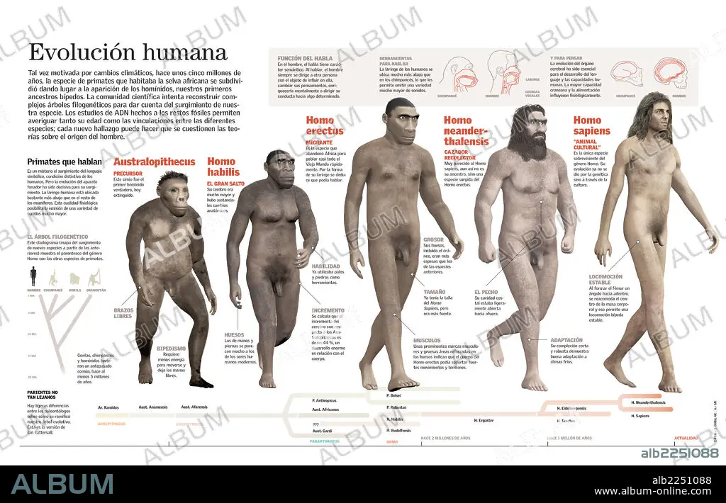 Infografía de la evolución del ser humano, desde el Australopithecus hasta el Homo sapiens actual.