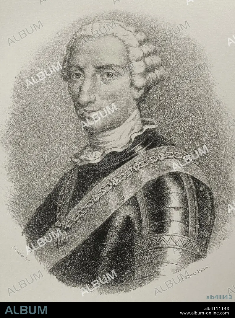 Carlos III de España (1716-1788). Rey de España desde 1759. Dibujo por J. Cebrián. Litografía. Retrato. Crónica General de España, Historia Ilustrada y Descriptiva de sus Provincias. Castilla-La Nueva, 1869. Biblioteca Histórico Militar de Barcelona, Cataluña, España.