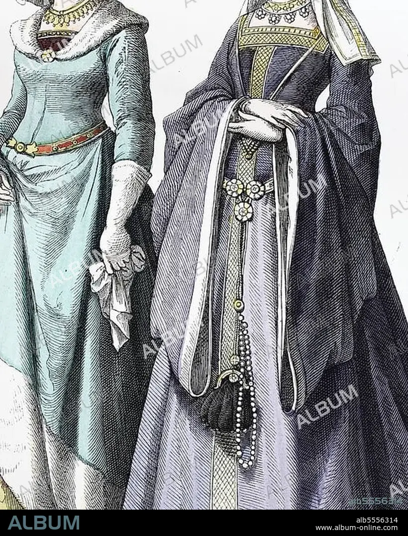 Folk traditional costume, clothing, history of costumes, German noble ladies, 1400-1450, Germany, historical, digitally restored reproduction of a 19th century original