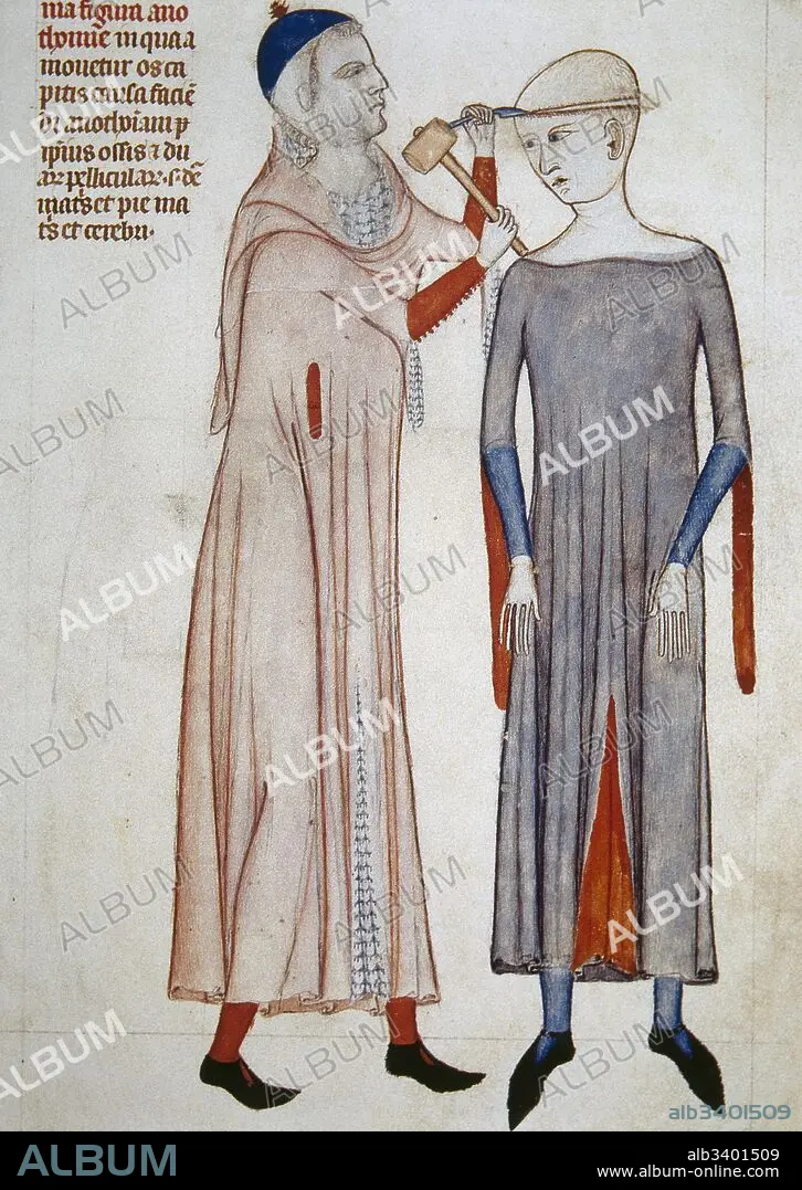 Descripción: Epoca Medieval. Cirujano médico realizando una trepanación. Siglo XV. Anatomia de Guy de Pavia, 1345. Artista anónimo. Museo Condé. Castillo de Chantilly. Francia.