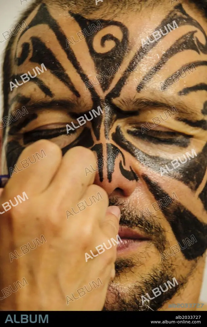 Caracterizacion y maquillaje de los guerreros musulmanes. Moros y cristianos. Pollença. Sierra de Tramuntana. Mallorca. Islas Baleares. Spain.
