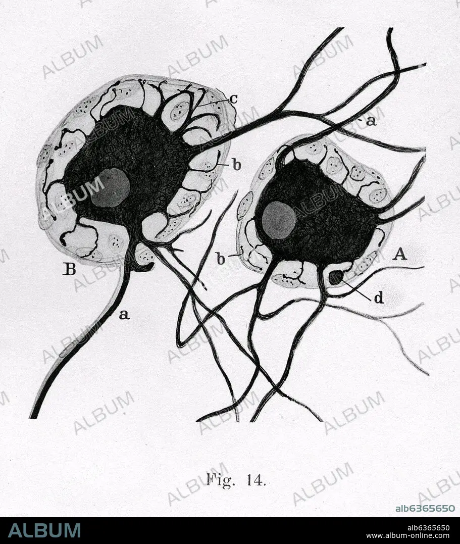 SANTIAGO RAMÓN Y CAJAL. A B CELULAS ESTRELLADAS DEL HOMBRE ADULTO a AXON b DENDRITAS CORTAS O APENDICES SUBCAPSULARES d APENDICE TERMINADO EN MAZA- DERECHOS