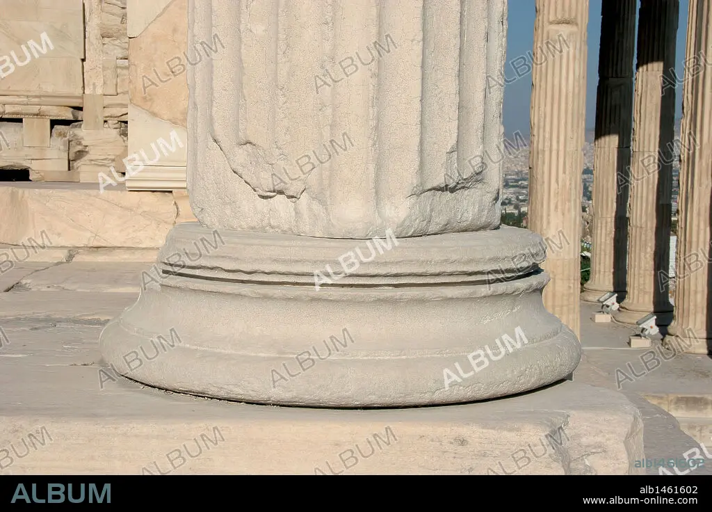 Descripción: ARTE GRIEGO. GRECIA. ERECTEION. Templo de estilo jónico iniciado en el año 421 a. C. por el arquitecto Filocles. Dedicado a dioses y héroes griegos. Detalle base de columna. ACROPOLIS DE ATENAS. Grecia.