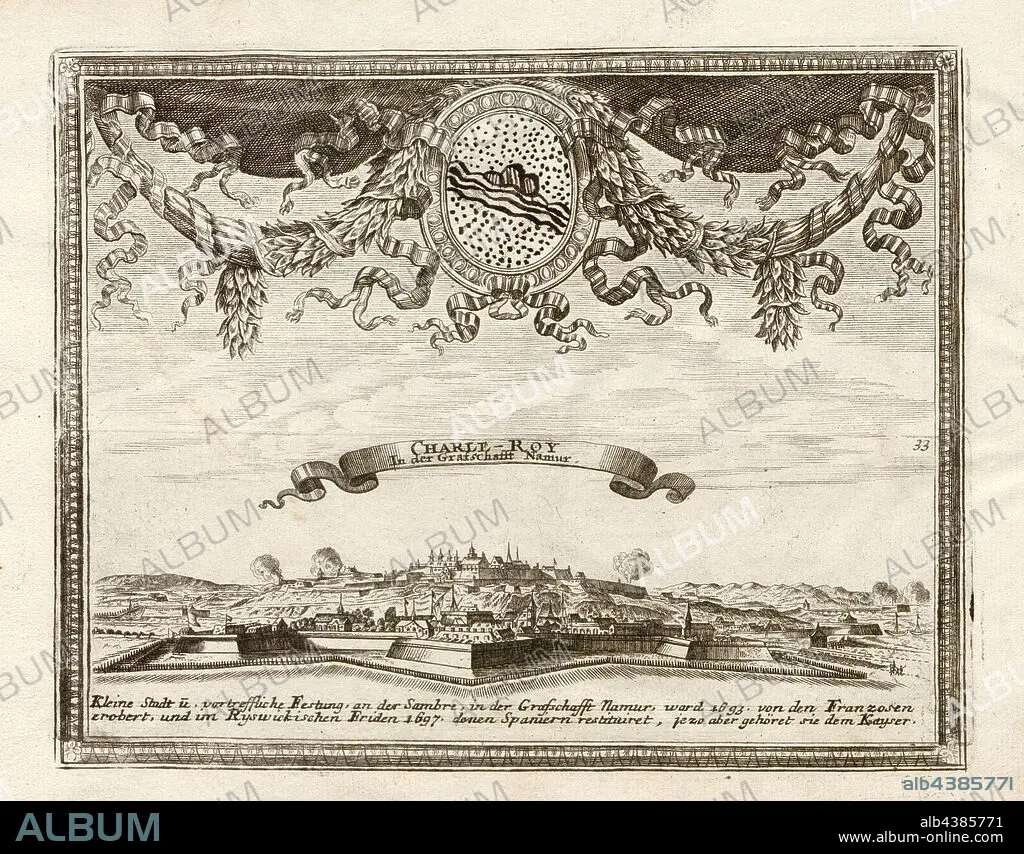 Charle-Roy, Charleroi in the Naumur region, signed: G. Bodenehr fec., et exc., a., v. Taf. 33, p. 33, Bodenehr, Gabriel d. Ä (fec. et exc.), 1710, Gabriel Bodenehr: Europens Pracht und Macht in 200 Kupfer-Stücken: worinnen nicht nur allein die berühmtest und ansehnlichste, sondern auch andere Stätte, Festungen, Schlösser, Klöster, Pässe, Residentien, Palläste, Wasserfälle dises volckreichen Welttheils vermittelst anmuthiger und eigentlicher Prospecte, sambt kurzer geographischer Beschreibung zu sonderm Nuzen u. Gemüth vergnügender Ergözung vorgestellet werden. Augspurg: [Selbstverlag], [ca. 1710]