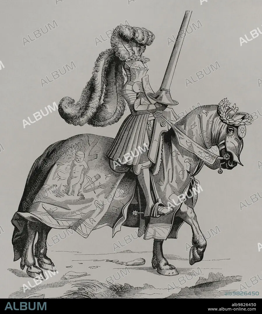 Descripción: Campeón de un torneo. Grabado por Burgmayer. Versión del siglo XIX a partir de un compendio titulado "Vita Imperatoris Maximiliani". Dibujo de Alberto Durero, siglo XV. "Vie Militaire et Religieuse au Moyen Age et à l'Epoque de la Renaissance". París, 1877.