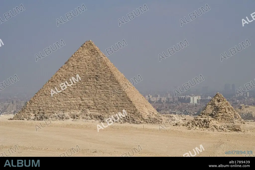 ARTE EGIPCIO. PIRAMIDE DE MICERINOS (MENKAURA). (2532-2504). Faraón del IMPERIO ANTIGUO de la IV DINASTIA. La menor de las tres pirámides, conocida por la "pirámide divina". La parte superior fue construida en piedra caliza y los cimientos y parte inferior con bloques de granito rosado debastados. Siglo XXVI a. C. A su izquierda tres pirámides satélite, posiblemente tumbas de reinas. Se cree que la primera y de mayores dimensiones perteneció a la reina Khameremebty (Khamerernebti). Necrópolis de El Giza. Egipto.