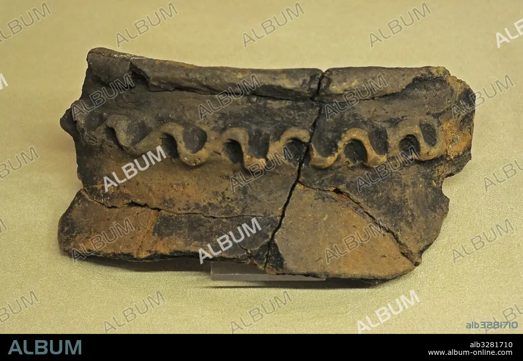 Descripción: Polonia. Prehistoria. Neolítico. Fragmento de un vaso de cerámica decorado. Exposición temporal "La Solución de cazadores Fok desde la Edad de Piedra en el Golfo de Puck" (marzo-junio de 2015). Museo Arqueológico. Gdansk. Polonia.