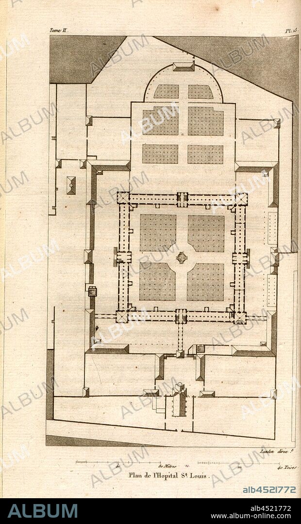 Map of St. Louis Hospital, Plan and floor plan Hôpital Saint-Louis in Paris, Pl. 15, after p. 72, p. 105, J. G. Legrand; C. P. Landon: Description de Paris et de ses édifices: avec un précis historique et des observations sur le caractère de leur architecture, et sur les principaux objets d'art et de curiosité qu'ils renferment. Seconde édition, corrigée avec soin dans toutes ses Parties, et considérablement augmentée. Bd. 2. Paris. Strasbourg. Treuttel et Würtz, 1818