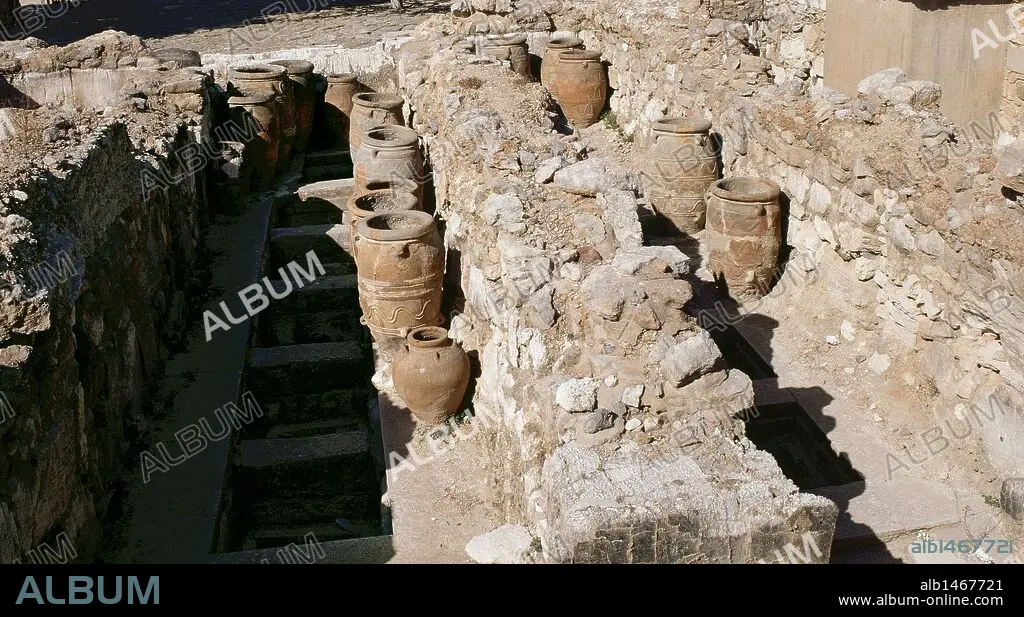 ARTE MINOICO. GRECIA. PALACIO DE KNOSSOS (1700-1450 a. C.). Vista parcial de los ALMACENES occidentales del palacio. Las grandes vasijas o "PHITOS" se utilizaban para el almacenamiento de aceite y vino. CRETA.
