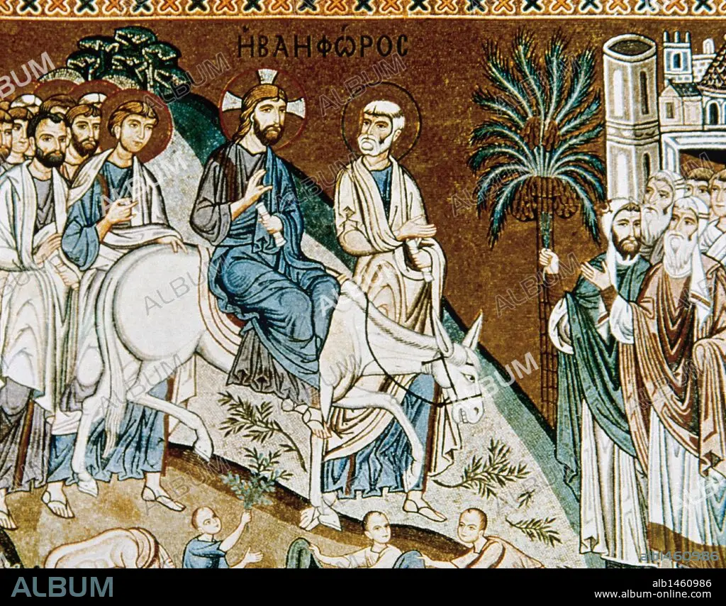 ARTE BIZANTINO. PALACIO DE LOS NORMANDOS (Palacio Real). Edificio de época árabe ampliado por los reyes normandos en el siglo XII. Detalle de uno de los mosaicos de estilo bizantino de la CAPILLA PALATINA (construída en 1140), con la representación de la ENTRADA DE JESUS EN JERUSALEN. Palermo. Sicilia. Italia.