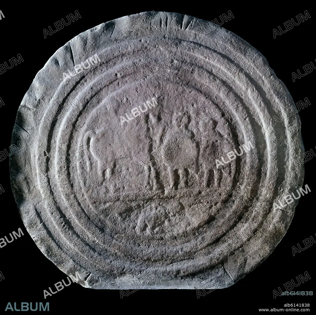 ESTELA DISCOIDEA CANTABRA DE ZURITA CON LA IMAGEN DE UN GUERRERO CANTABRO CON SU CABALLO Y SU ESCUDERO - SIGLO I AC