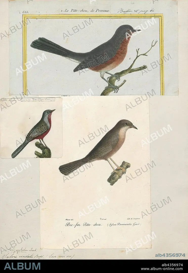 Sylvia undata, Print, The Dartford warbler (Sylvia undata) is a typical warbler from the warmer parts of western Europe and northwestern Africa. It is a small warbler with a long thin tail and a thin pointed bill. The adult male has grey-brown upperparts and is dull reddish-brown below except for the centre of the belly which has a dirty white patch. It has light speckles on the throat and a red eye-ring. The sexes are similar but the adult female is usually less grey above and paler below., 1700-1880