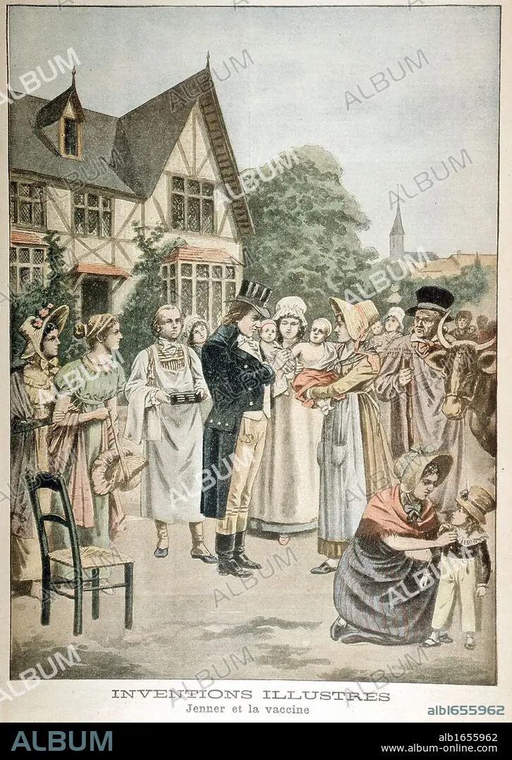 Edward Jenner (1749-1823) English physician, vaccinating a child against Smallpox using Cowpox serum. Artist's impression from "Le Petit Journal", Paris, 1901.