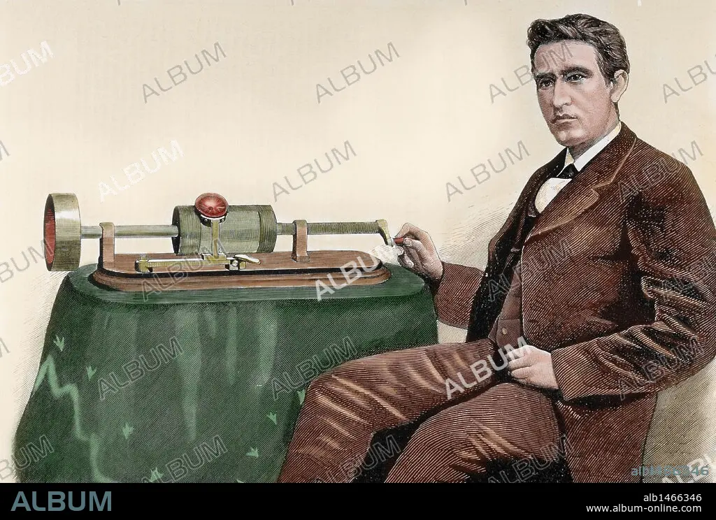 Descripción: EDISON, Thomas Alva (Milan, Ohio,1847-West Orange, Nueva Jersey,1931). Inventor estadounidense. Entre sus inventos más importantes destacan el del fonógrafo (1877) y la lámpara de incandescencia (1879). En 1927 fue nombrado miembro de la National Academy of Sciences. Grabado coloreado.