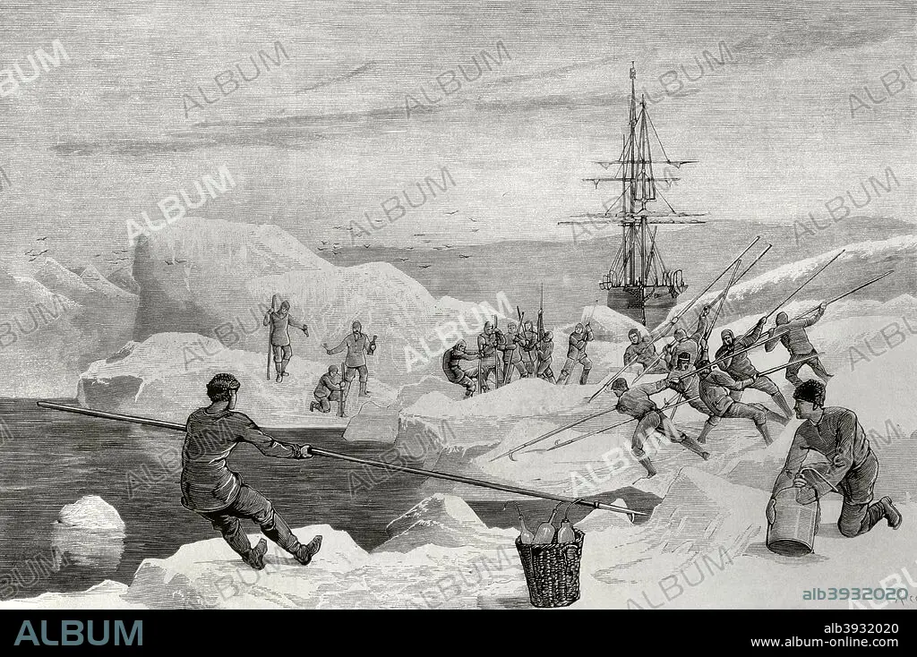Expedición Artica Británica (1875-1876), dirigida por George Strong Nares (1831-1915). No lograron alcanzar el Polo Norte, pero realizaron reconocimientos de las costas de Groenlandia y de la isla Ellesmere. Tripulantes del barco HMS Alert atrapado en la banquisa, abriendo un canal en el mar helado para dar paso al buque. Grabado por Rico. La Ilustración Española y Americana, 30 de noviembre de 1876. Biblioteca Histórico Militar de Barcelona. Cataluña, España.