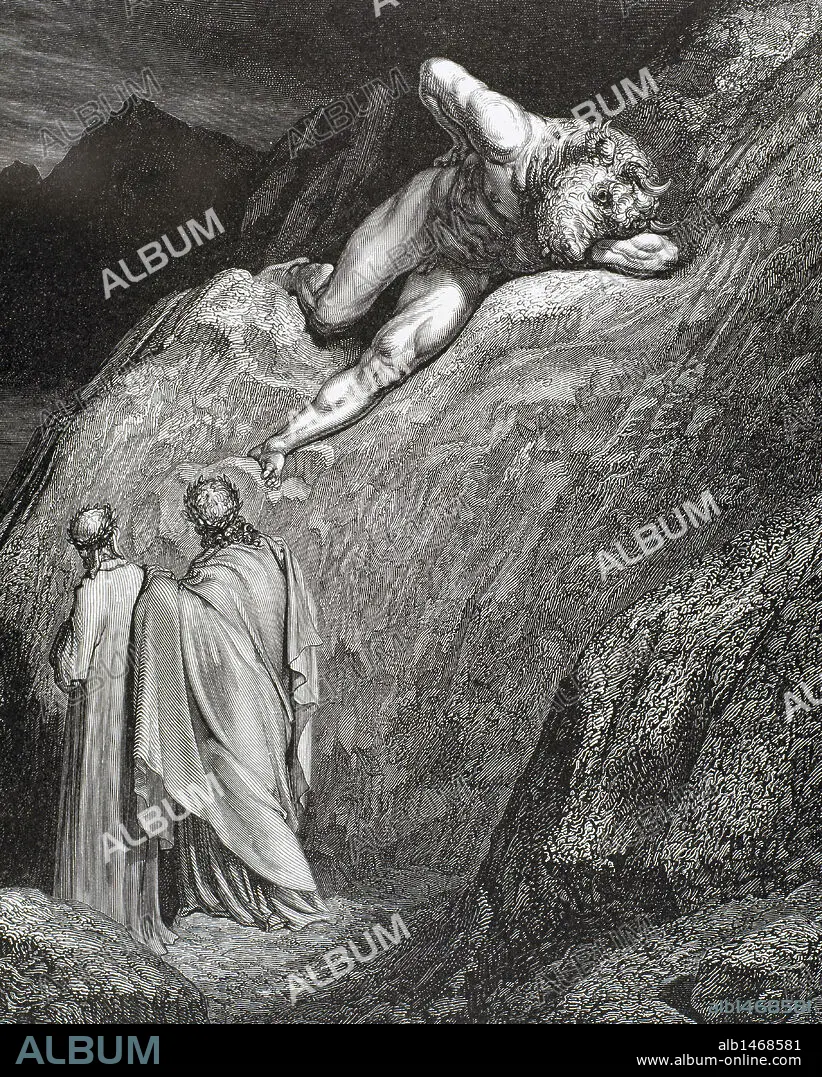 Descripción: "LA DIVINA COMEDIA". Poema escrito en toscano donde se relata el viaje de su autor, DANTE ALIGHIERI, para llegar a la CONTEMPLACION DIVINA. "Y AL BORDE DE LA CAVERNA ESTABA TENDIDO EL QUE FUE OPROBIO DE CRETA" (Infierno, c. XII). Grabado de Gustave DORE.