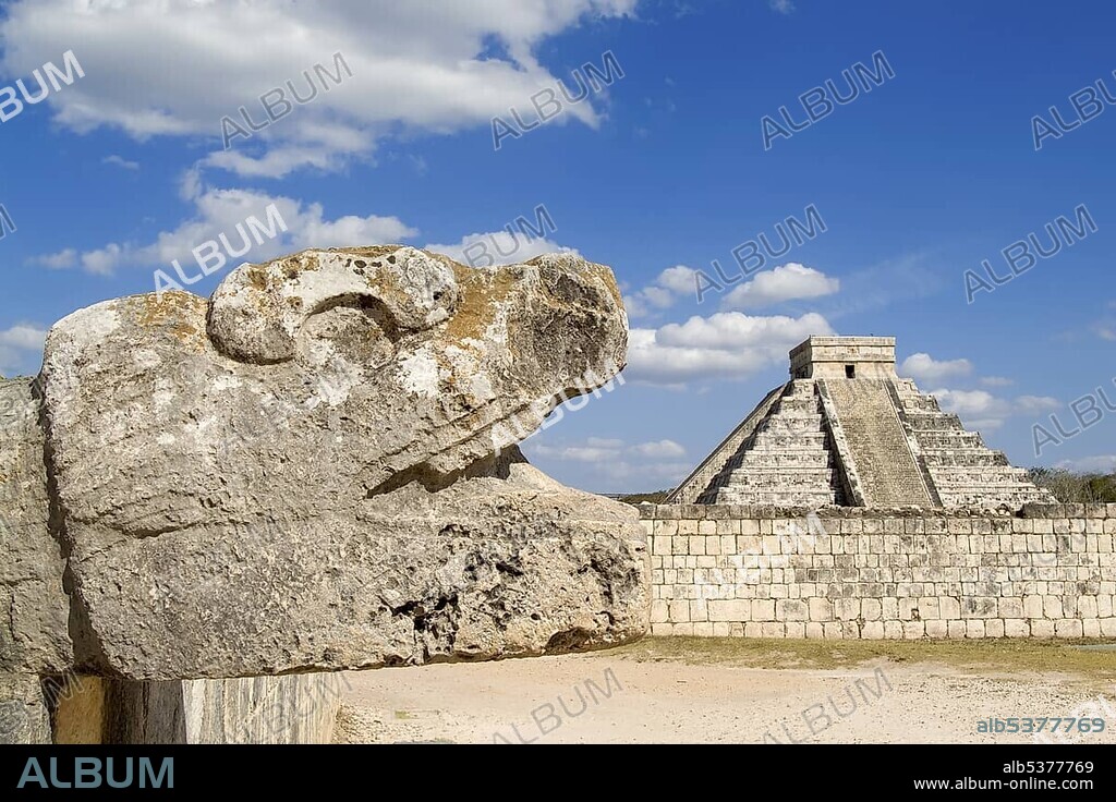 Chichen Itza, Quetzalcoatl, Feathered Serpent deity and Stepped pyramid of Kukulkan, El Castillo in the background, Yucatan, Mexico, UNESCO World Heritage Site Quetzalcoatl, Feathered Serpent deity, Stepped pyramid of Kukulkan, El Castillo - The Castle, Chichen Itza; Yucatan, Mexico, UNESCO World Heritage Site Quetzalcoatl, Dieu du Serpent à plumes, Pyramide en terrasses de Kukulkan, El Castillo ? Le château, Chichen Itza ; Yucatan, Mexique, Site du Patrimoine Mondial de l?UNESCO Quetzalcoatl, Schlangengottheit, Pyramide des Kukulcan, Stufenpyramide, El Castillo ? Das Schloss, Chichen Itza, Yucatan, Mexiko, Welterbe der UNESCO, Central America