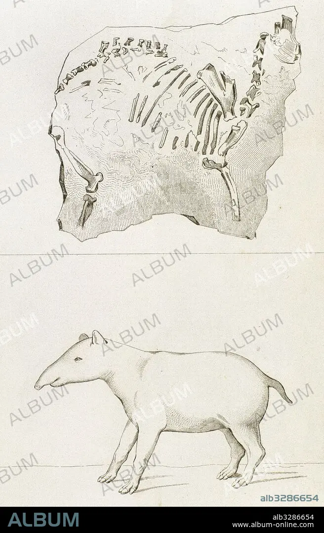 Prehistoria. Palaeotherium minus (bestia antigua) hallado en Francia. Dibujo de Vernier. Grabado por Corbié, 1840.