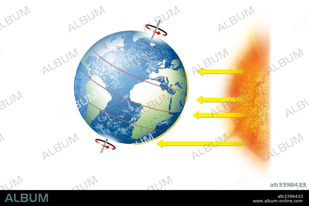 Descripción: Rayos solares en el ecuador: los rayos que llegan al ecuador lo hacen perpendicularmente sobre una superficie más reducida que en otras latitudes por lo que el calentamiento es mayor