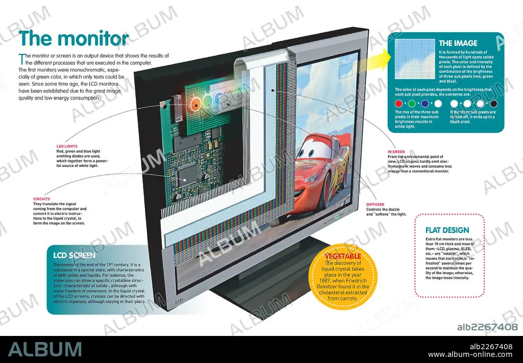 Infografía de los componentes y funcionamiento del monitor o pantalla del ordenador y su evolución hasta los actuales, los monitores de LCD.