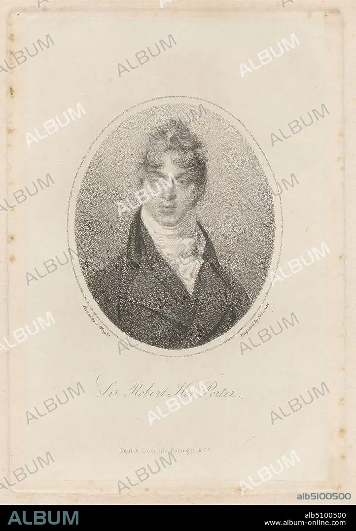 Sir Robert Ker Porter, Print made by Samuel Freeman, 17731857, British, after John Wright, active 1812, Published by Paul and Dominic Colnaghi & Co, established 1760, active ca. 17851911, Italian, active in Britain, undated, Stipple engraving and etching on moderatley thick, slightly textured, cream wove paper with cream chine collé, Sheet: 11 7/8 x 8 5/8 inches (30.1 x 21.9 cm), Plate: 6 9/16 x 4 1/2 inches (16.6 x 11.5 cm), Sheet: 6 1/4 x 4 1/8 inches (15.8 x 10.4 cm), and Image: 3 9/16 x 2 15/16 inches (9 x 7.4 cm), collar, cravat, curls, diplomat, gaze, painter, portrait, posing, writer.