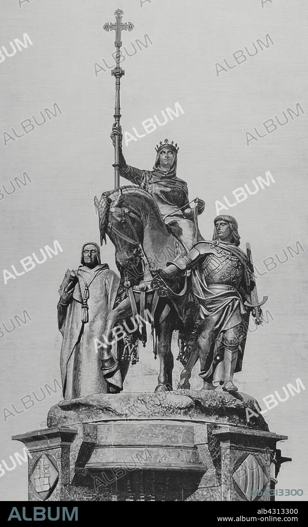Descripción: Isabel I de Castilla (1451-1504). Reina de Castilla (1474-1504). Esposa de Fernando II de Aragón. Grabado representando el monumento a Isabel la Católica erigido en Madrid, inaugurado a finales de noviembre de 1883. Se trata de un grupo escultórico fundido en bronce por Alessandro Nelli (1842-posterior a 1897), a partir del modelo diseñado por el escultor Manuel Oms (1842-1889). Isabel aparece cabalgando sobre un corcel, alzando en la mano derecha la cruz románica de la Reconquista. Las otras dos figuras que completan el grupo son, el cardenal Pedro González de Mendoza (1428-1495) y Gonzalo Fernández de Córdoba (1453-1515), conocido como el Gran Capitán. La Ilustración Española y Americana, 8 de enero de 1884.