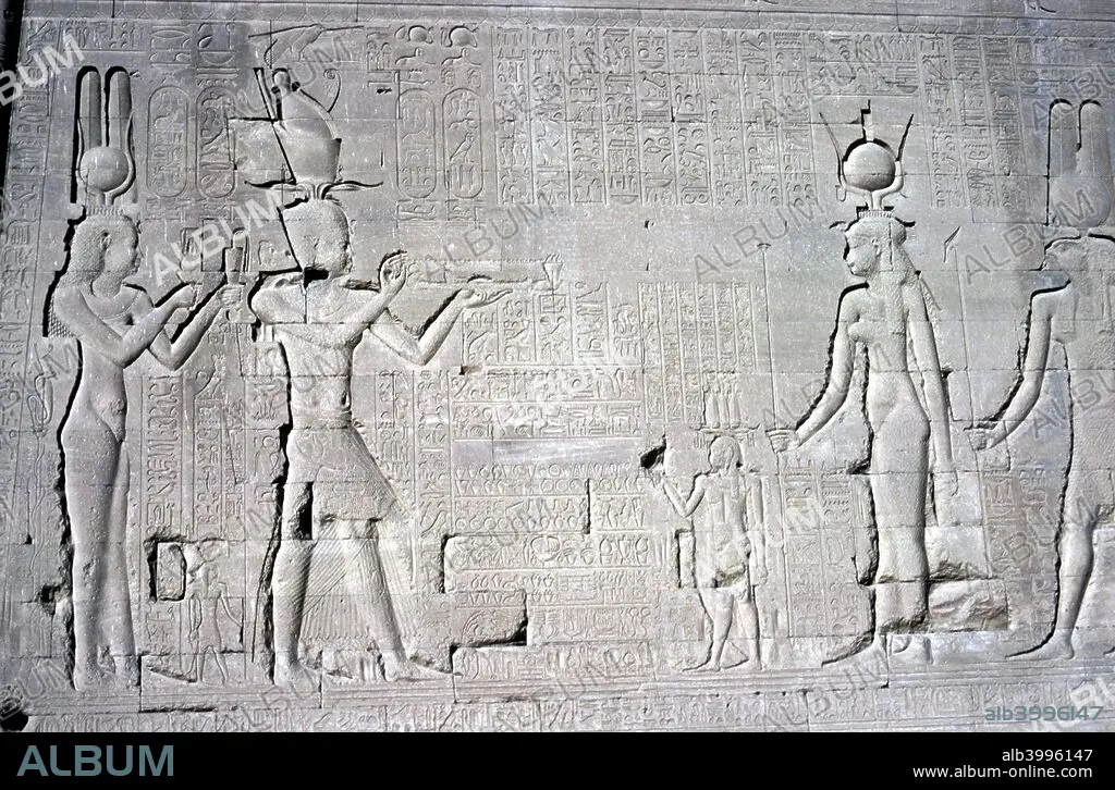 Relief of Cleopatra VII and Caesarion (her son by Julius Caesar) before Isis and Osiris, Temple of Hathor dedicated to Hathor and Horus the Elder, Abydos, Egypt, late Ptolemaic & Roman Periods, c125 BC-c60 AD.