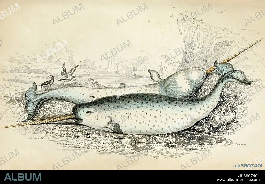 The narwhal, or narwhale (Monodon monoceros), is a medium-sized toothed whale and possesses a large tusk from a protruding canine tooth. It lives year-round in the Arctic waters around Greenland, Canada, and Russia. It is one of two living species of whale in the Monodontidae family. Inuit people, who call a tusked narwhal qilalugaq tugaalik, are allowed to hunt this whale species legally for subsistence. Narwhals have been extensively hunted the same way as other sea mammals, such as seals and whales, for its large quantities of fat which are one of the most important resources of the native people in Arctic regions. Almost all parts of the narwhal, meat, skin, blubber and organs are consumed. Whale is the common name for various marine mammals of the order Cetacea. All cetaceans have forelimbs modified as fins, a tail with horizontal flukes, and nasal openings (blowholes) on top of the head. Whales inhabit all the world's oceans and number in the millions. Human hunting of whales from the seventeenth century until 1986 radically reduced the populations of some whale species. They are long-lived, humpback whales living for up to 77 years, while bowhead whales may live for more than a century. Whales by Robert Hamilton, 1843.