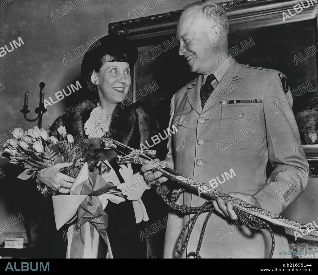 General Eisenhower Named North Atlantic Defense Force Commander -- General of the Army Dwight D. Eisenhower and Mrs. Eisenhower with the Sword of Honor presented to the General as a gift from Queen Wilhelmina of the Netherlands in appreciation for his able leadership of the Allied Forces in liberating the people of Holland in 1945. This is only one of approximately forty decorations from foreign countries which have been presented to the General. The list of governments which have so honored him reads like the roster of the United Nations and includes Czechoslovakia, Poland and Russia. May 24, 1951. (Photo by United States Information Service).