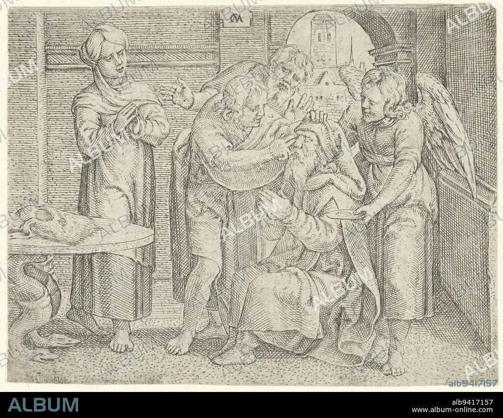 On the homecoming of Tobias and the angel, Tobias puts the fish's gall on the eyes of his blind father Tobit. Afterwards, Tobit can see again. Anna looks on from the left, Healing of Tobit History of Tobias (series title), print maker: Cornelis Massijs, (mentioned on object), Antwerp, 1544 - 1556, paper, engraving, h 73 mm × w 95 mm