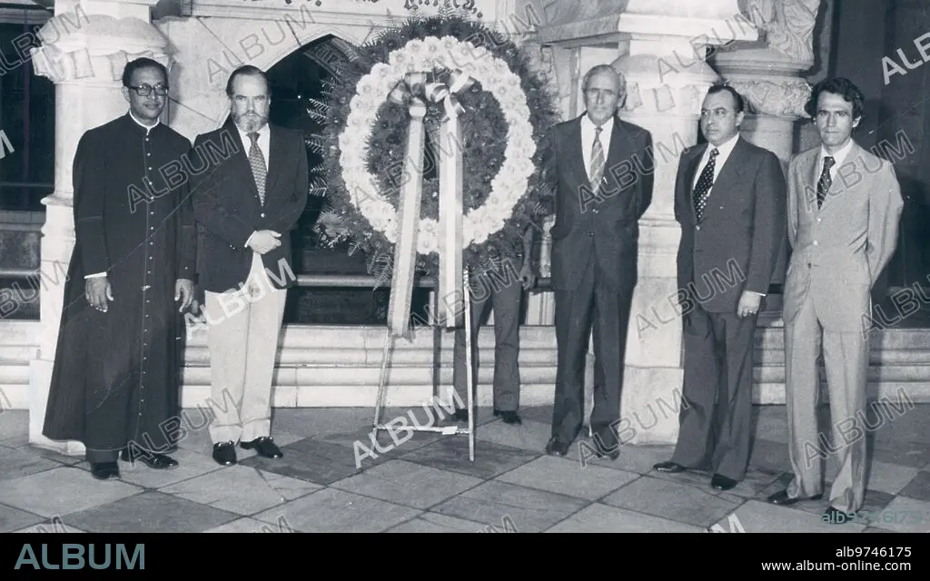 Julio 1978. El presidente de Iberia, Manuel prado y colón de Carvajal, Realiza una ofrenda de Flores ante la tumba de Cristóbal colón en la catedral de santo Domingo (república Dominicana)